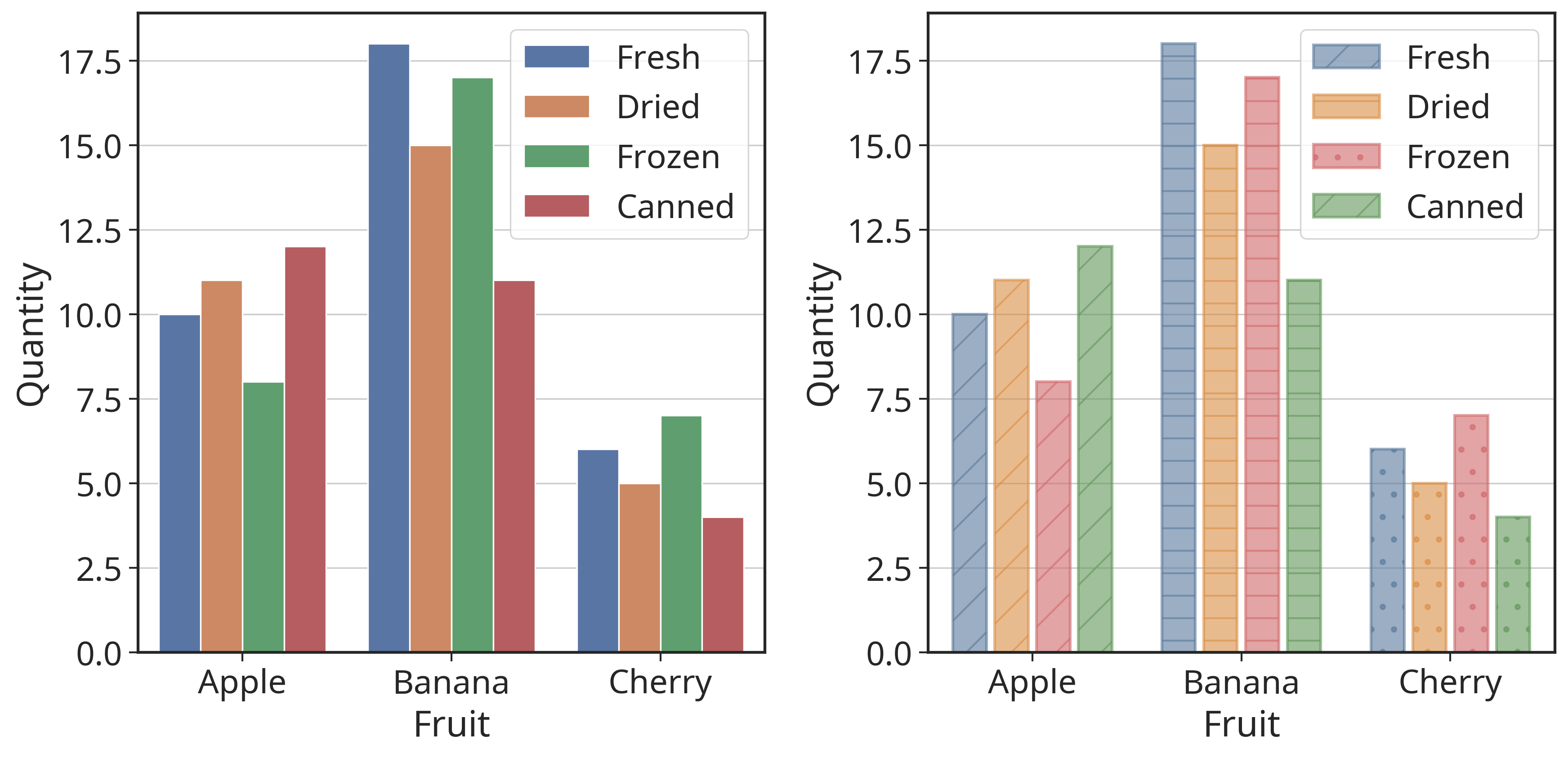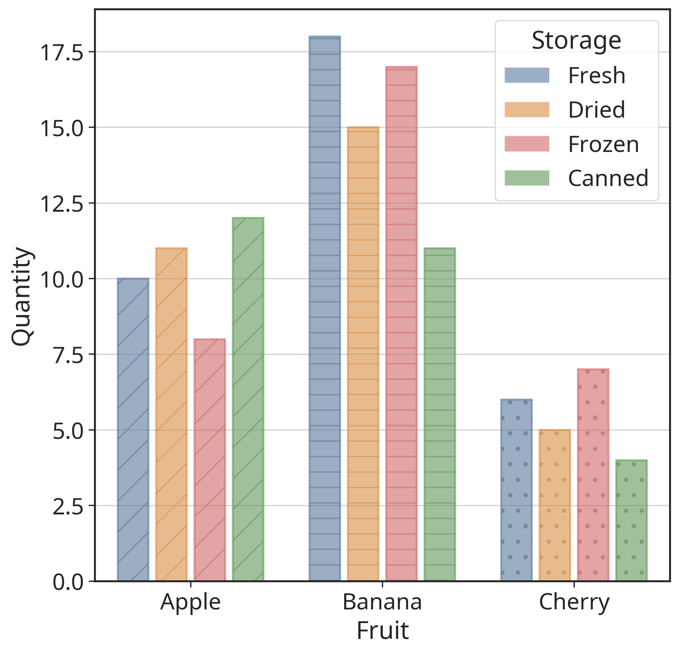 For more hatch pattern options and examples, see Matplotlib Hatch Style Reference.