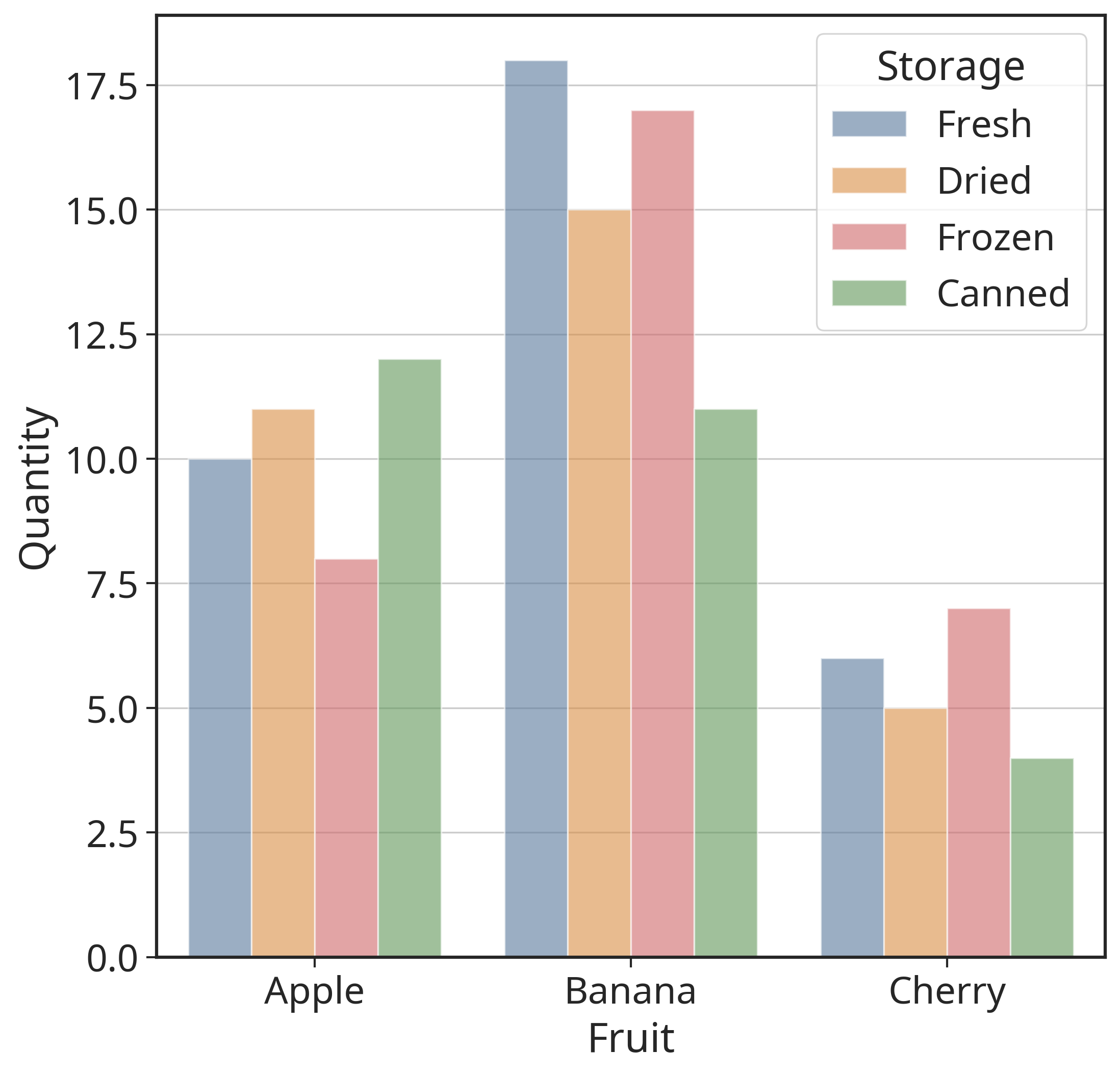 We plot the bar plot with seaborn on the axes we create with matplotlib. We apply a subtle transparency to the colors of the bars.