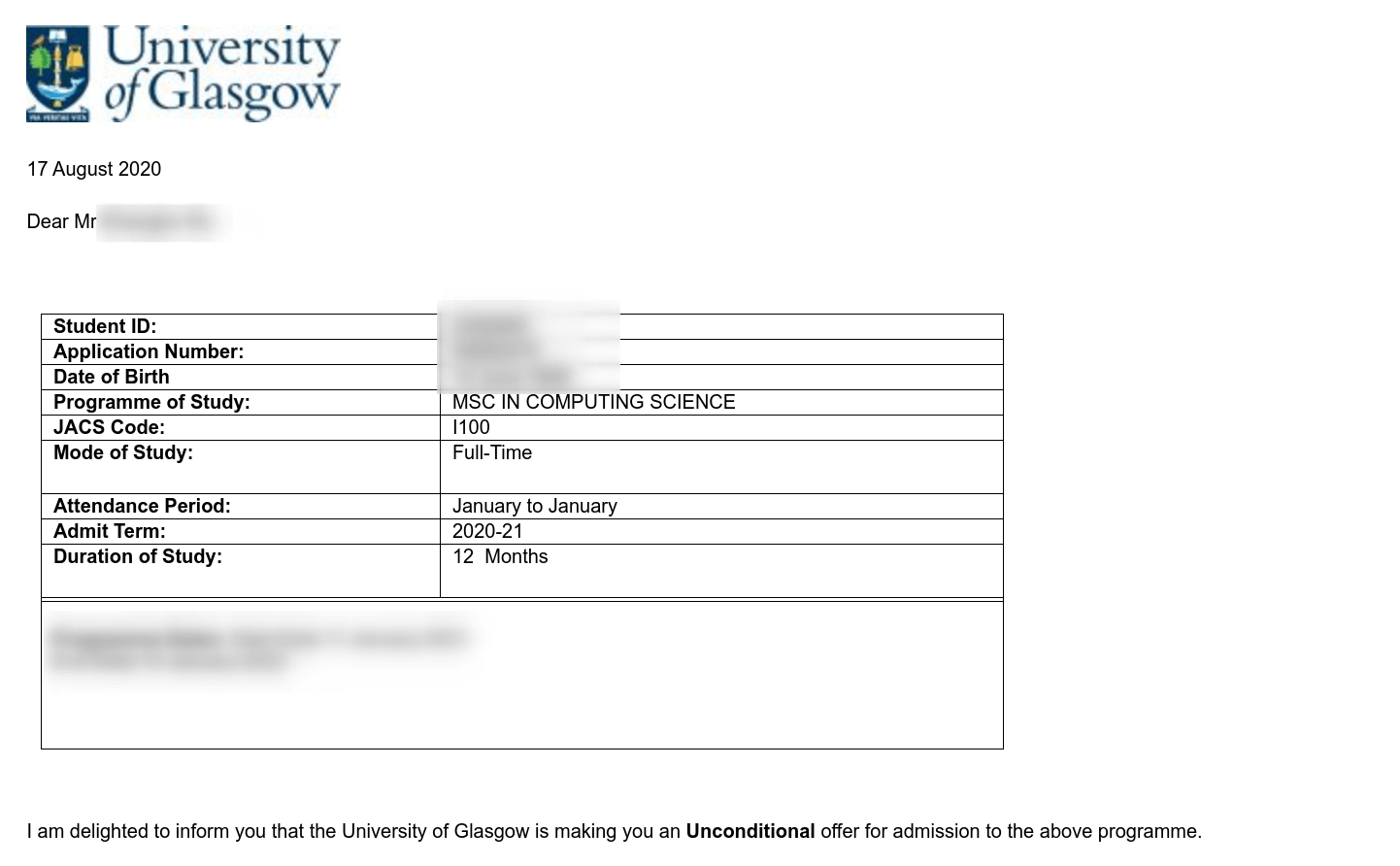 当然,这些可能是唯一的遗憾了。我们划掉重来,看看 2020 年开心的事情。7 月后的日子仿佛过得飞快,先是疫情总算缓解,和零零散散(但是玩的最好)的几个同学终于约上了去云南的毕业旅行,那 10 天可能是 2020 年里面过得最快的 10 天。这期间,毕业的事情尘埃落定,我也拿到了校「优秀」毕业设计的成绩、为同学们制作 LaTeX 毕业论文模板的酬金、以及大学最后一学期的学业奖学金。另外,未来的硕士学校 University of Glasgow 也给我发来了 Unconditional Offer 的邮件。事情总算好了起来。
