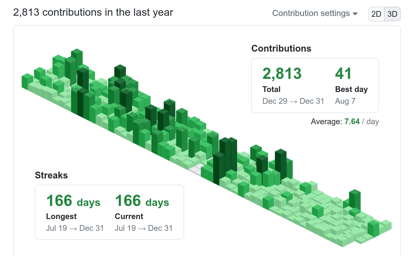 GitHub 贡献榜单或许是最能说明问题的了,截止到 2020/12/31,我全年贡献了 2813 个 commit,实际上除了过年的那几天以及毕业旅行的几天,我几乎每天都有 commit,自己还算骄傲的!其实还挺明显的,不过就是——前半年的我在忙着毕业,后半年的我在忙着科研嘛 🤣。