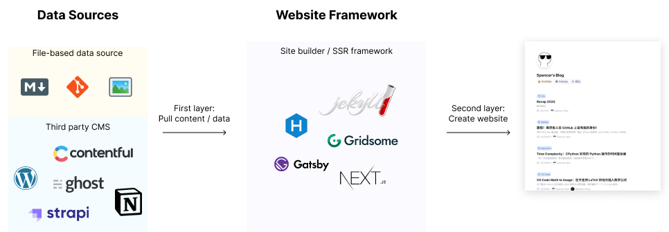 The second layer, rendering the content, is handled by our website generator, where it makes use of the data that we provide in the first layer, and compiles / renders the website on demand. Again, conventional blog engines (Hexo, Hugo, Jekyll) get their data during build-time, and requires rebuilding the entire site when data is updated (like updating articles, publishing new articles, etc.). Newer frameworks (like Next.js) are able to take advantage of "server-side rendering" (SSR) that guarantees to return the newest content pulled from layer one without having to rebuild or re-render the whole site.