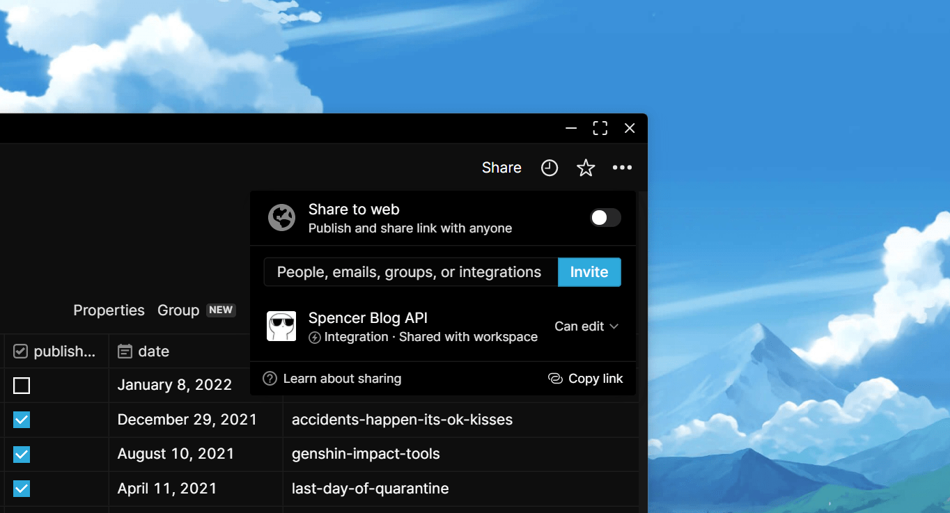 So, the great migration begins. To use the API, you would first need to create an integration at Notion - My integrations. You will give it a name, and select the workspace you want to invite it into. Next, you'll need to add that integration into the database that holds your blog posts.