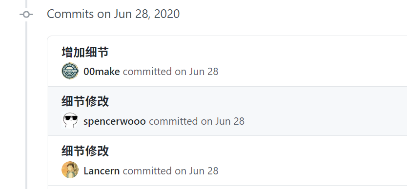 可以发现,每个 commit 都拥有 commit 的 author 和 commit 的 committer,分别是 commit 的第一作者和执行 commit 具体操作的人。如何确认这两人的具体身份呢?Git 仅记录了 commit author 和 committer 二人的名称、邮箱和时间戳,而其中的名称和邮箱正是我们配置 Git 时设定的 user.name 和 user.email,而 GitHub 也正是通过这两个内容确定 commit 的具体作者和 GitHub 身份的。