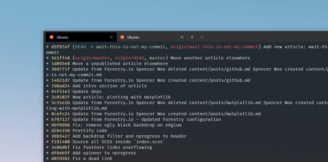 事实上,Git 本身是具有这样的设计缺陷的。Git commit 信息的 author 是一个可以零成本造假的字符串。首先,我们来看看一个 commit 里面包含哪些信息。我们可以用 git log(或 Oh My Zsh 的 alias 命令:glog 来打印一个更为清楚的 commit 历史)来查看本地 Git 仓库的 commit 记录,并找到一个特定 commit 的 hash,比如我当前仓库的 HEAD commit hash 为 d3f97ef。