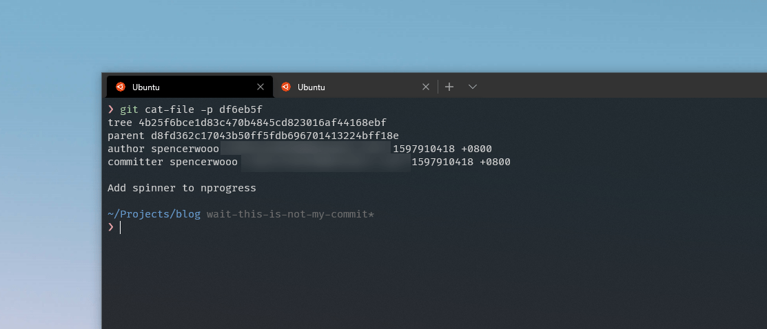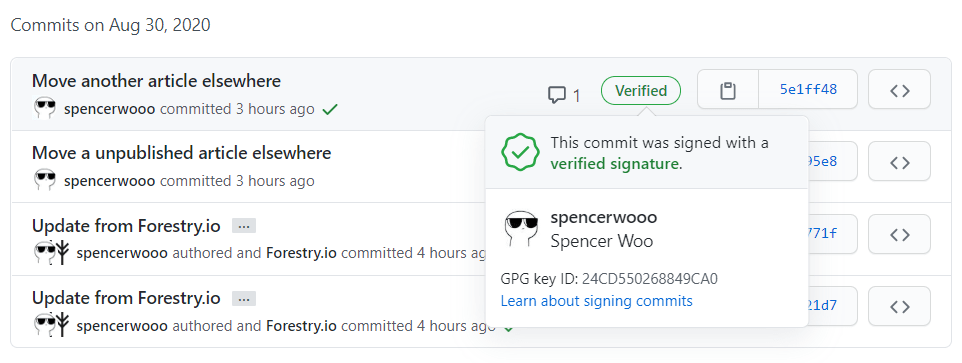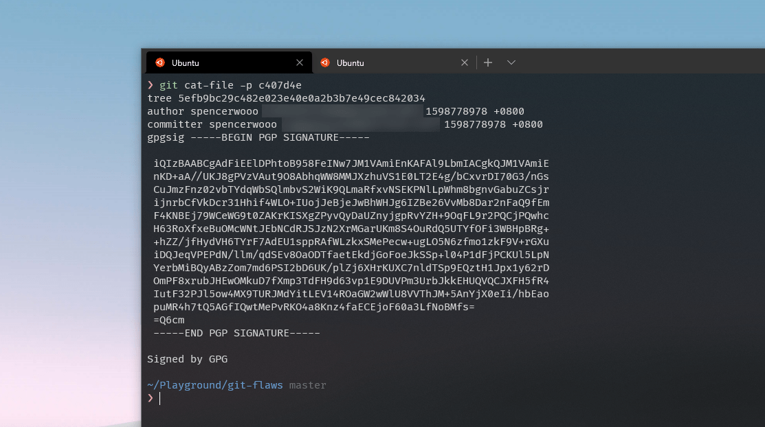 另外,此时我们再次用之前查看 commit 详细信息的命令查看本次 commit,我们会发现 GPG 签名已经直接保存于这一 commit 之中了: